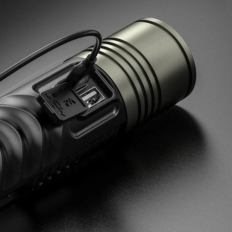 Med en praktisk Type-c USB-laddningsfunktion kan du enkelt ladda ficklampan när batteriet är lågt. Det medföljande 26650-batteriet är utbytbart och låter dig ha en kontinuerlig användning av ficklampan.